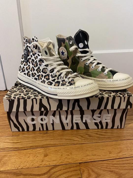 Level up your sneaker game with the eye-catching Cnvrs Chuck 70 Split Edition, combining two iconic prints – military camo on one shoe and star-spangled navy on the other. This high-top sneaker set isn’t just footwear—it’s a wearable conversation piece, made for those who stand out from the crowd.
